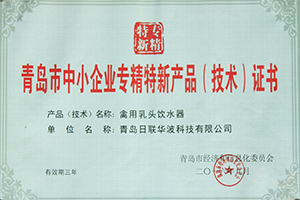 青島日聯(lián)華波科技有限公司禽用乳頭飲水器獲得青島市經(jīng)濟(jì)和信息化委員會青島市中小企業(yè)專精特新產(chǎn)品(技術(shù))證書;